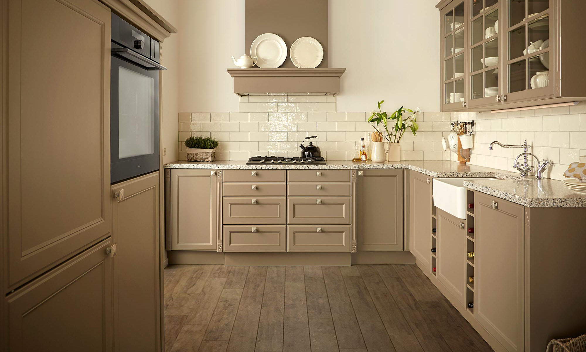 De bovenkasten met glasdeuren en pilasters accentueren de klassieke sfeer van deze keuken. Grijs, greige en gebroken wit geven de huiselijke sfeer. De houten vloer maakt het hier extra warm. De keramische spoelbak geeft de keuken die echt landelijke boerderijsfeer.